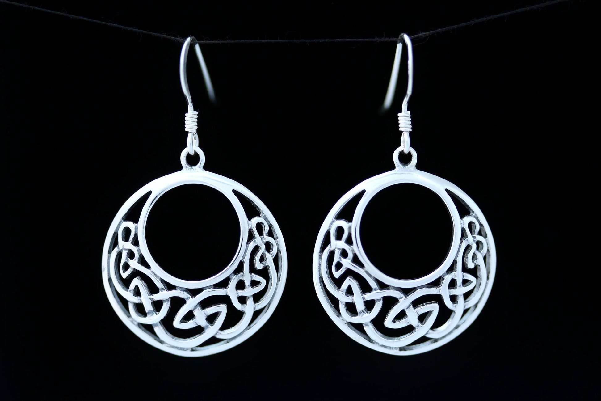 A Pair of Hallmarked 925 Sterling Silver Celtic Knot Earrings with an Elegant Half Moon in a Celtic knot design inspired by the Book of Kells.