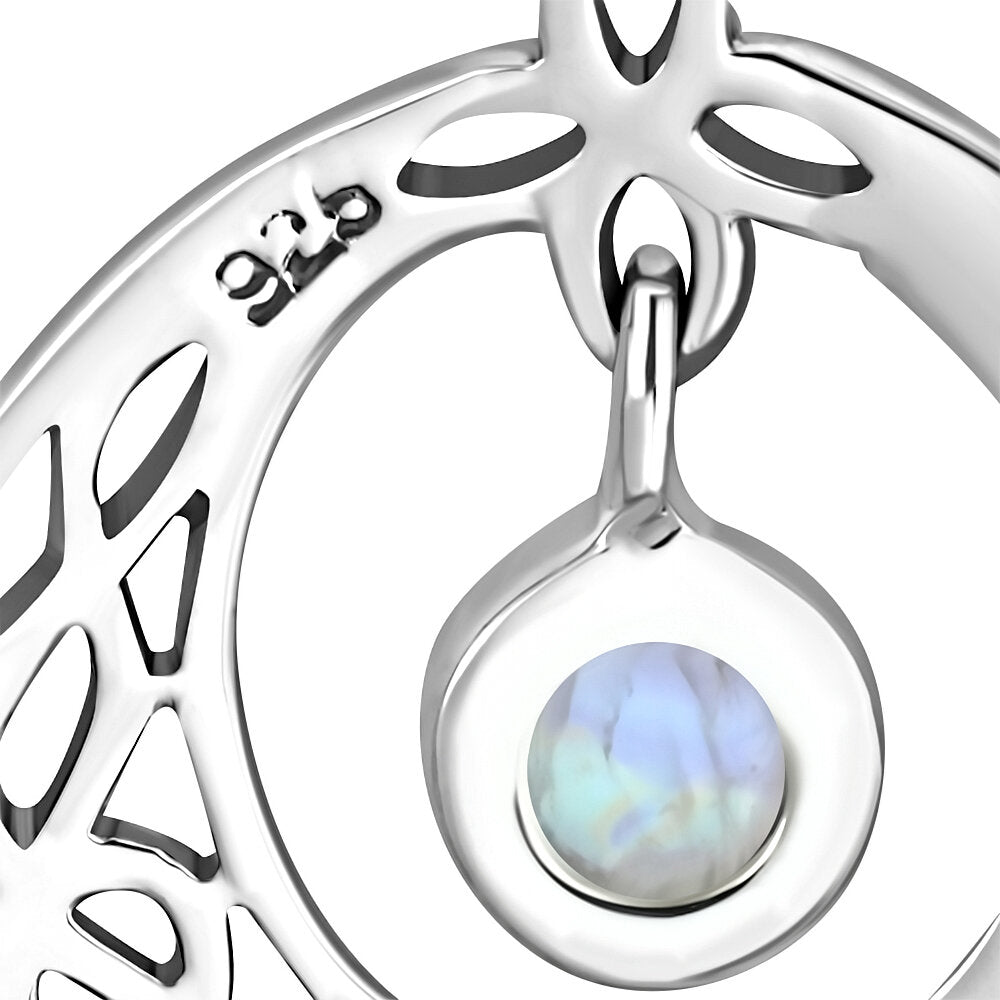 Half moon Kells knot earrings with a round moonstone drop, set in hallmarked 925 Sterling Silver.