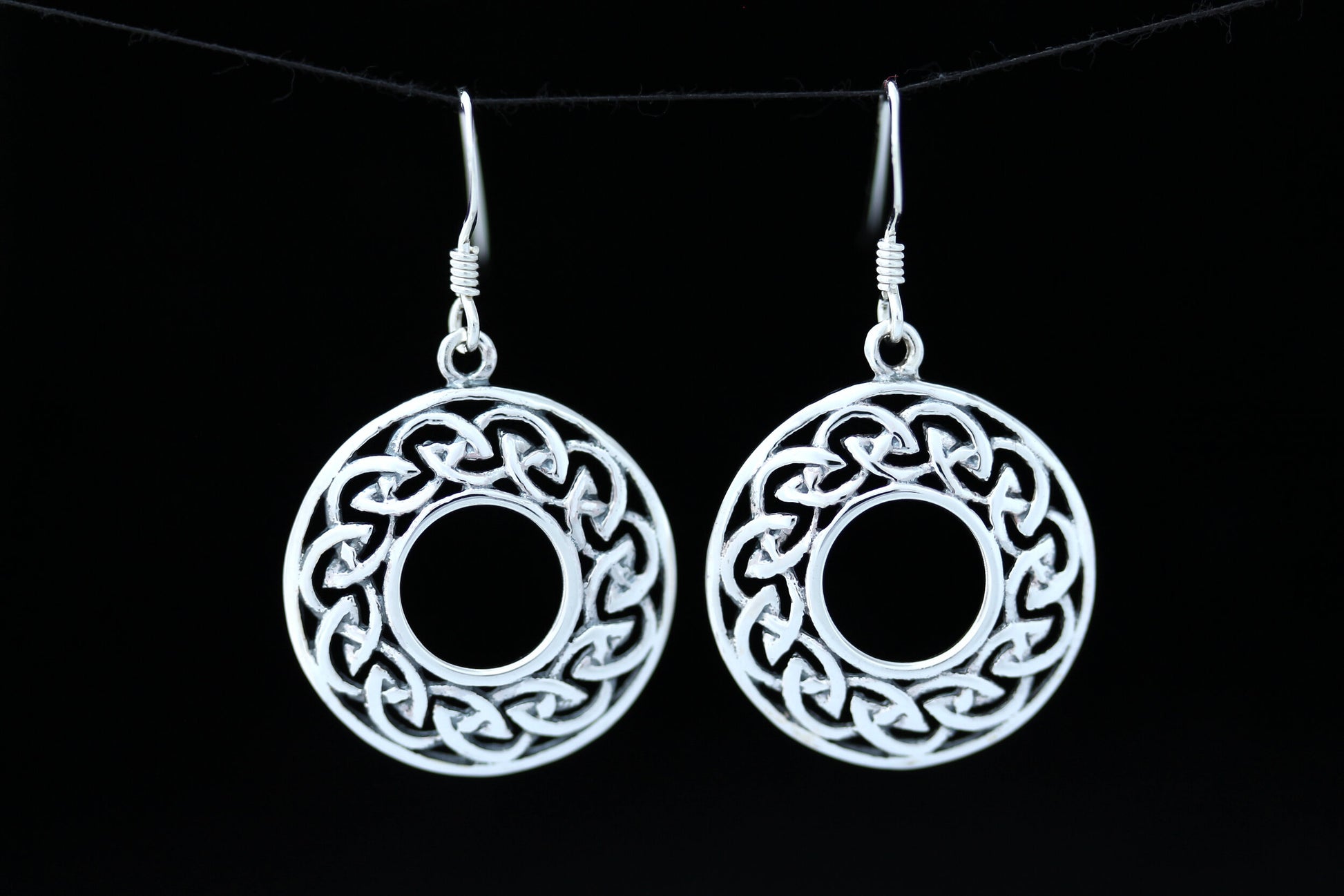 A Pair of Hallmarked 925 Sterling Silver Celtic Knot Earrings with an Elegant Circular Design.