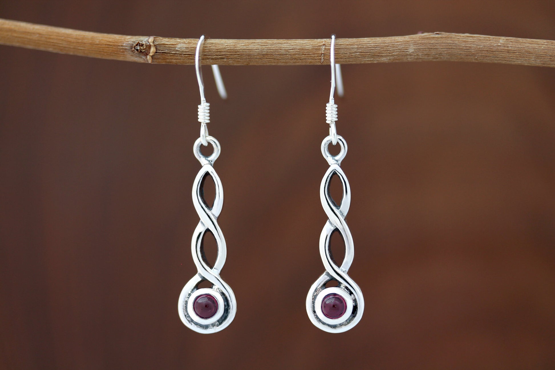 Simple looped Celtic earrings with Red Garnet set in hallmarked 925 Sterling Silver.