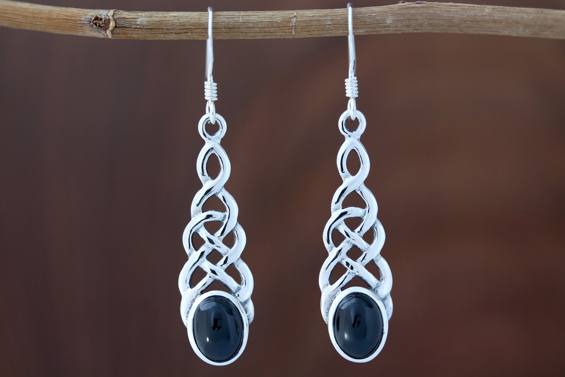 Long looped Celtic earrings with Black Onyx set in hallmarked 925 Sterling Silver.
