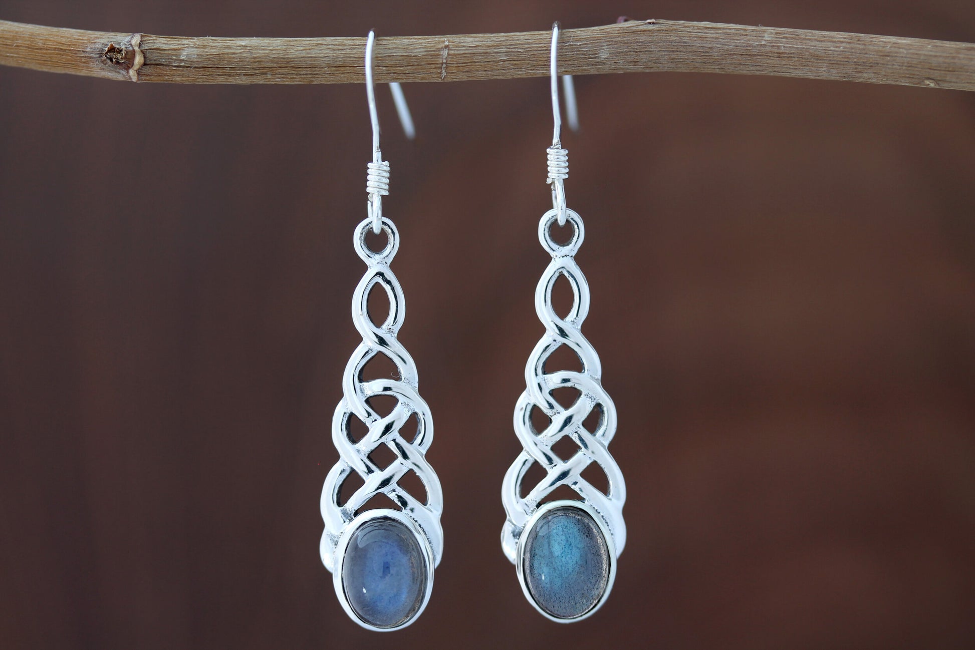 Long looped Celtic earrings with Labradorite set in hallmarked 925 Sterling Silver.