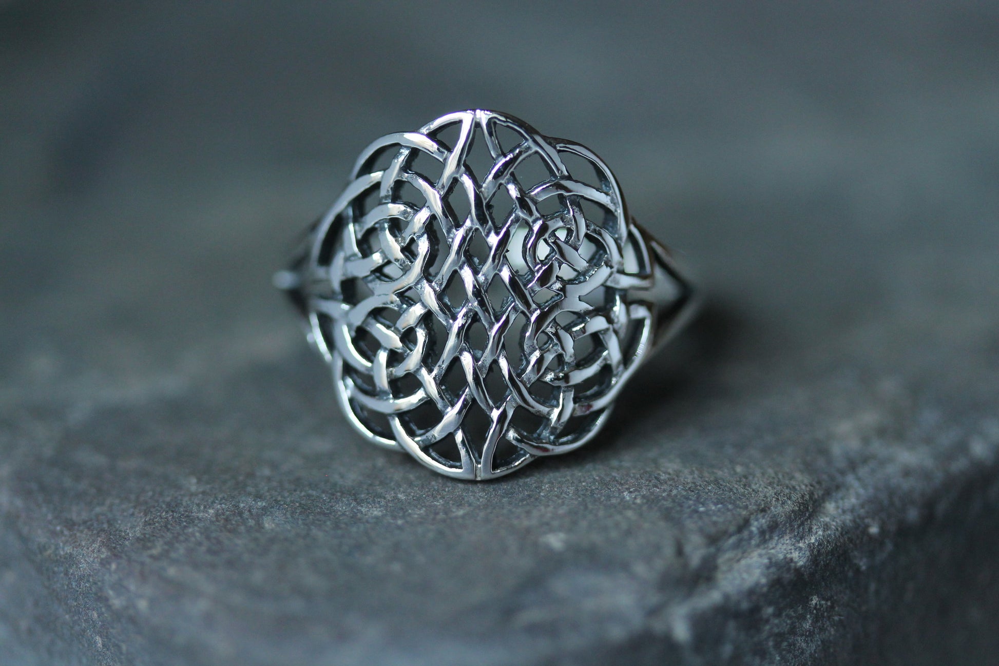A Hallmarked 925 Sterling Silver Celtic Knot Ring with a curved Dara knot face.