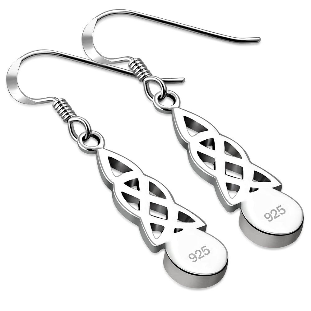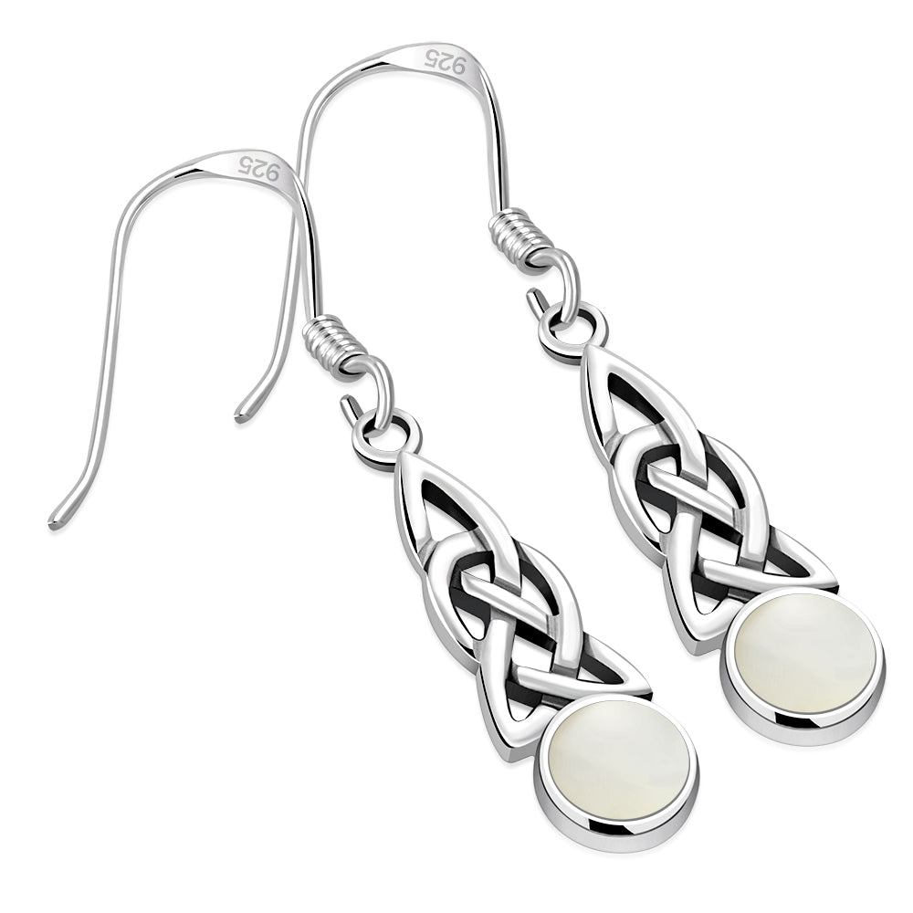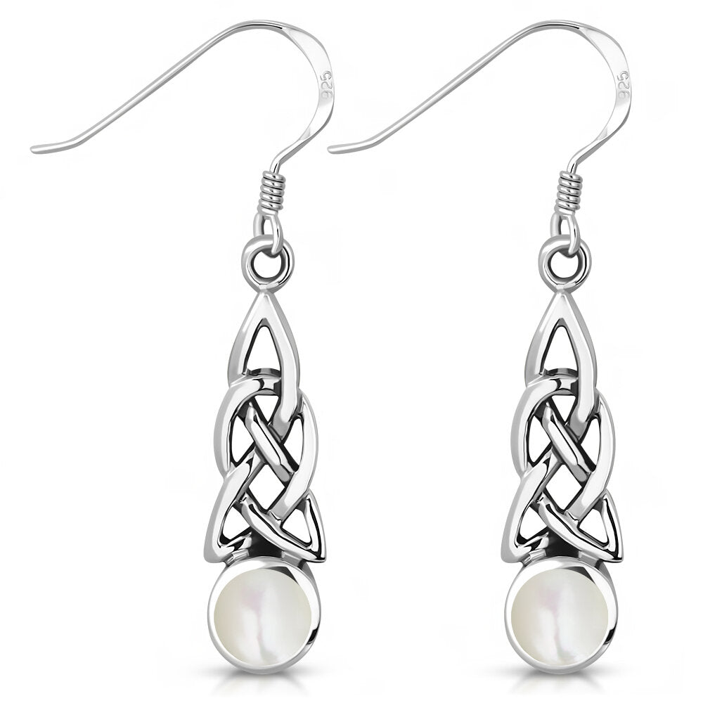 A pair of Sterling Silver 925 hanging Celtic knot earrings finished with a smooth Mother of Pearl drop