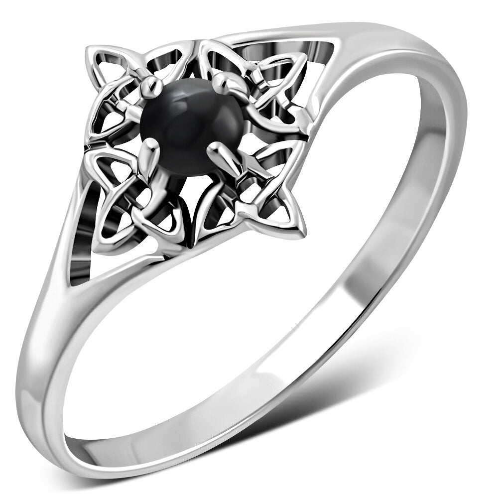Celtic Knot Ring with Round Black Onyx cabochon set in hallmarked 925 Sterling Silver.
