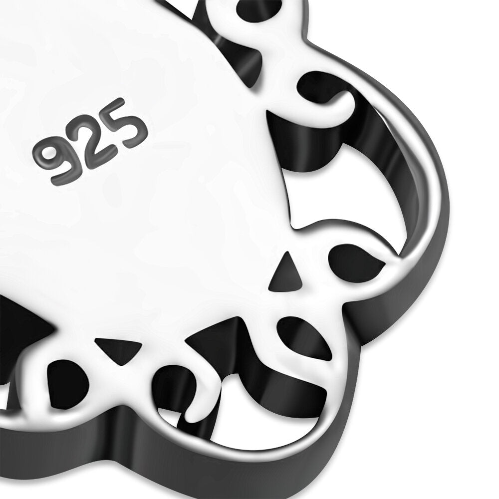 An oval Mother of Pearl stone set in Hallmarked 925 Sterling Silver in a floral wreath design.