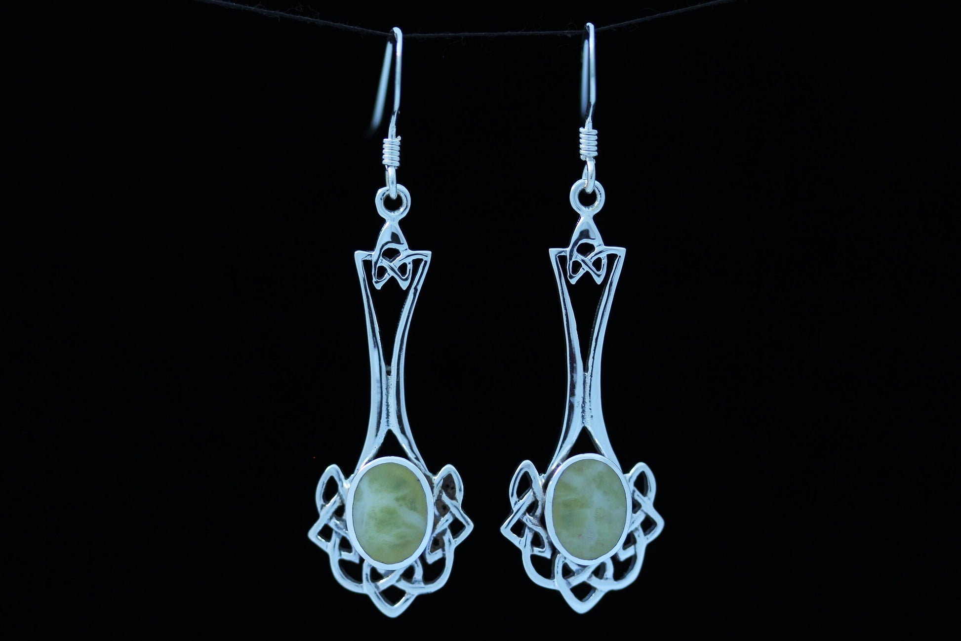 An Intricate Pair of Hallmarked 925 Sterling Silver Celtic knot earrings set with Scottish Marble cabochons.