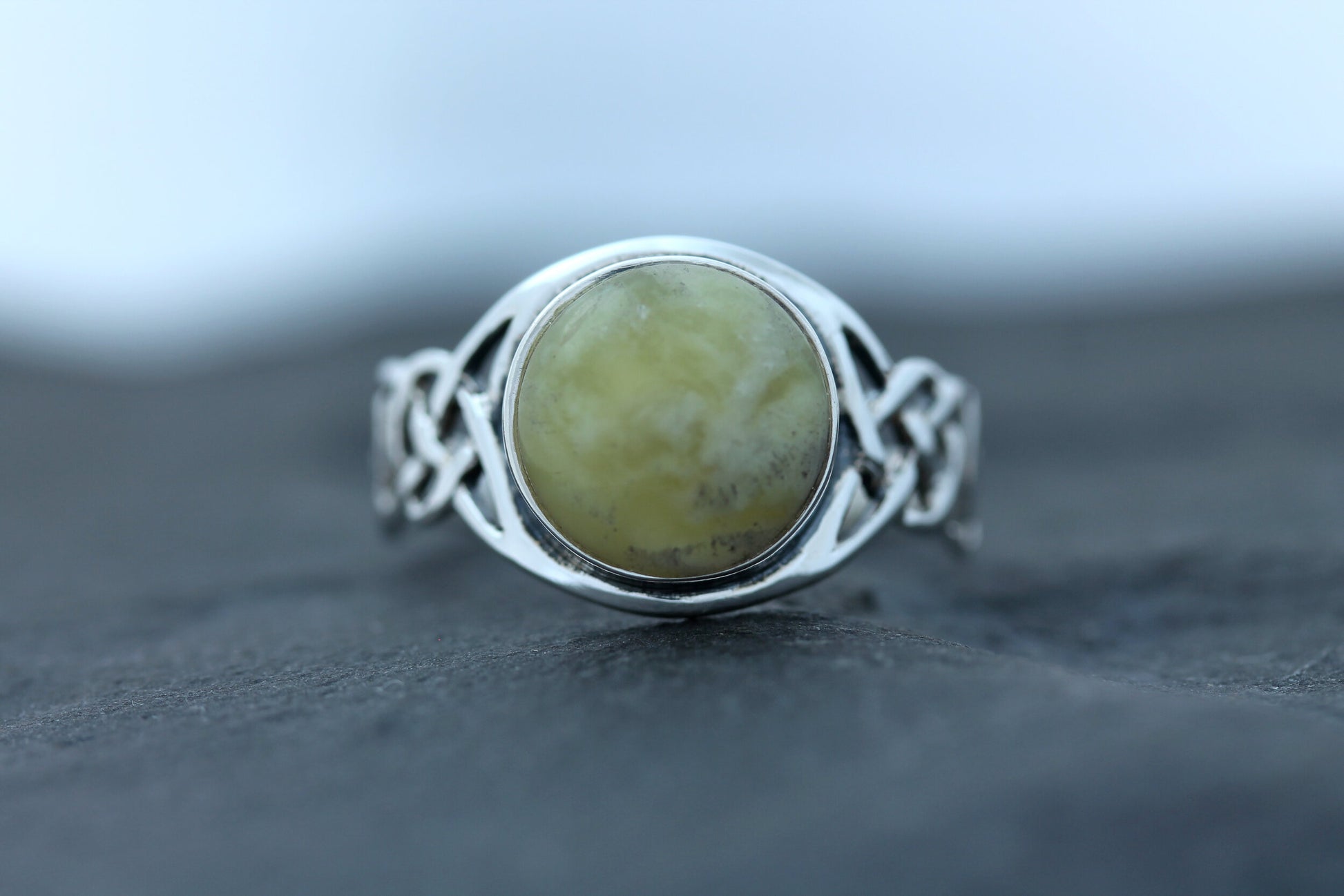A Hallmarked 925 Sterling Silver Celtic loop ring featuring round Scottish Marble.
