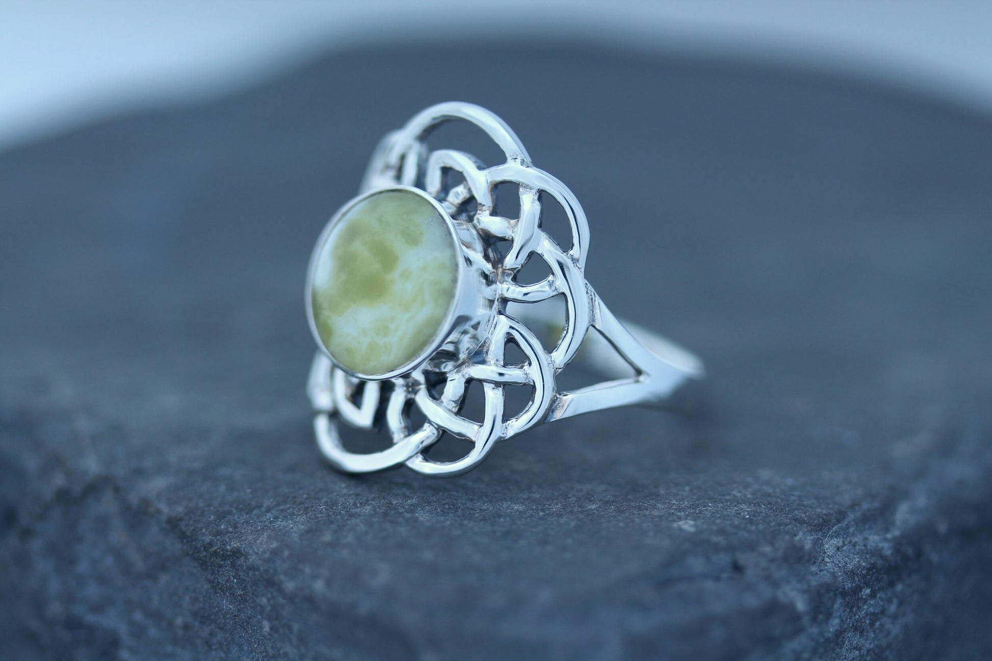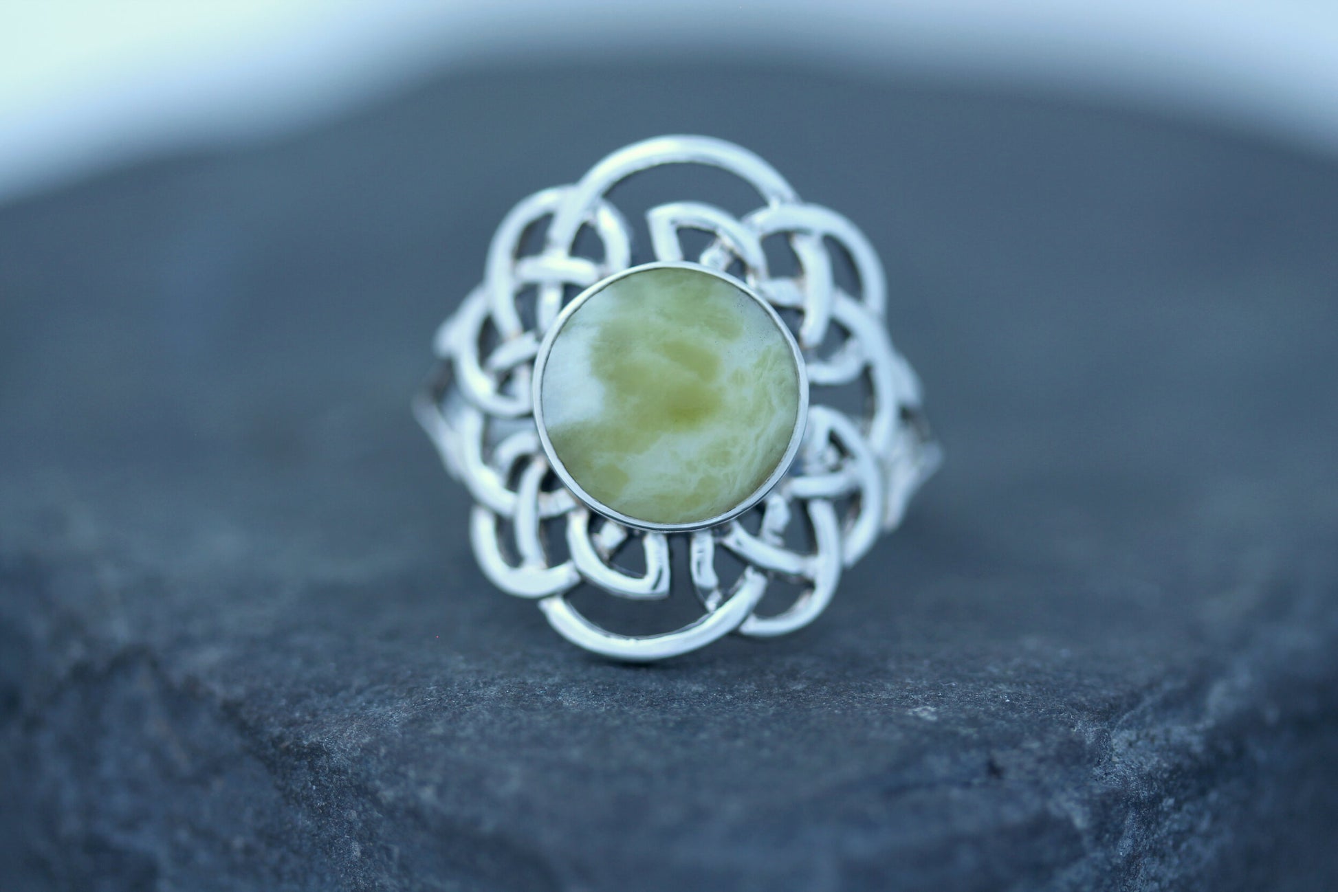 A Hallmarked 925 Sterling Silver Celtic Flower ring featuring round Scottish Marble.