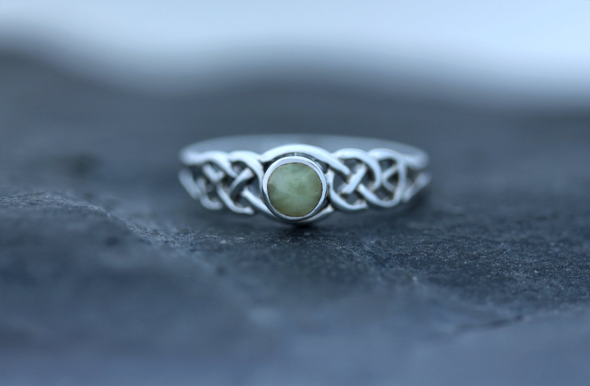 A Hallmarked 925 Sterling Silver Celtic double loop ring featuring round Scottish Marble.