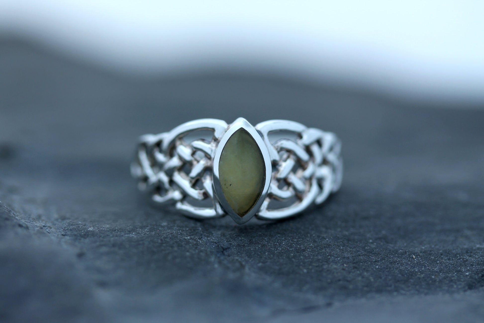 Celtic Knot Ring with Marquee shaped Scottish Marble stone set in hallmarked 925 Sterling Silver.