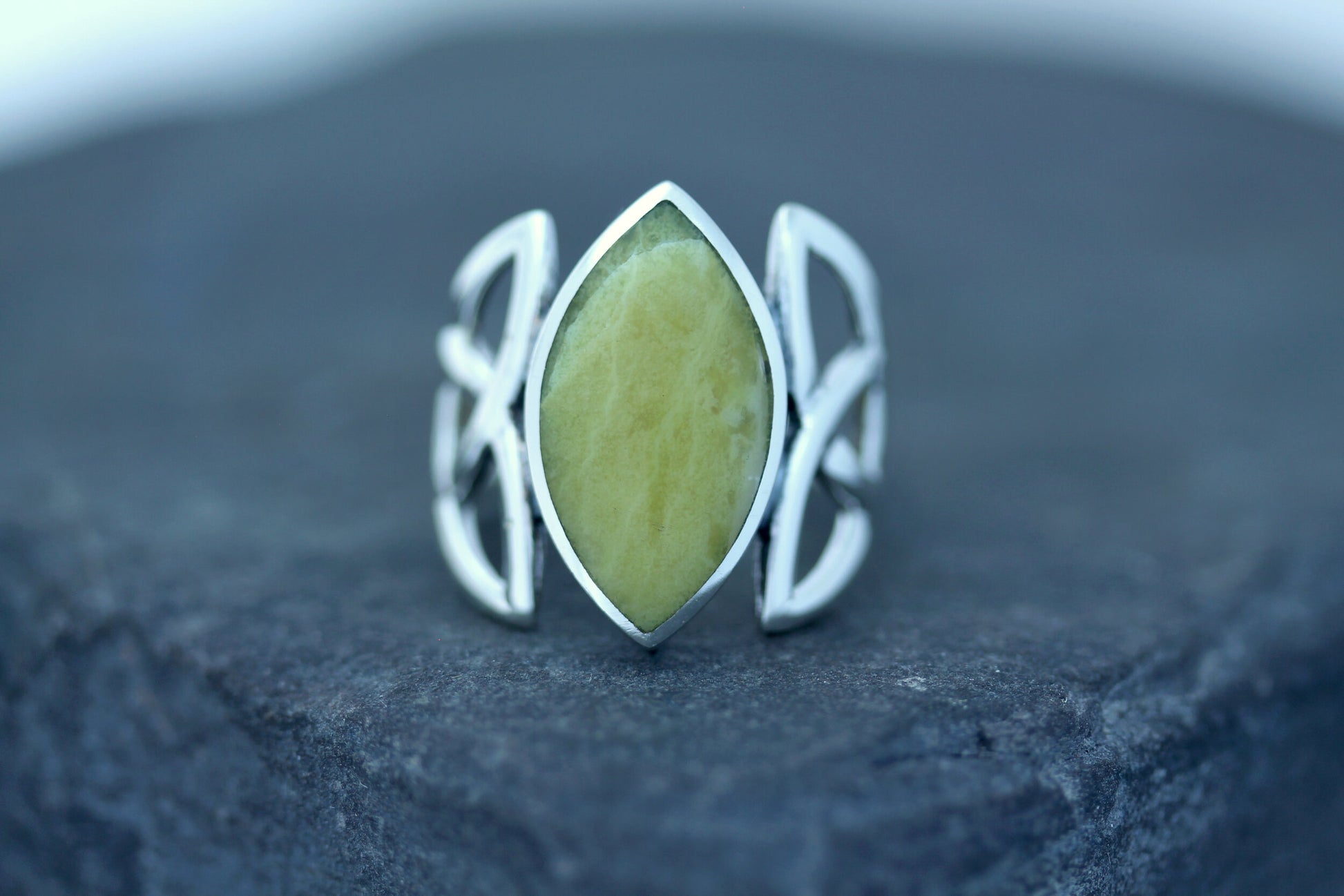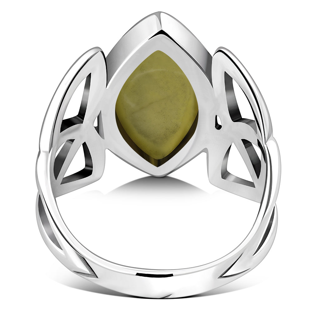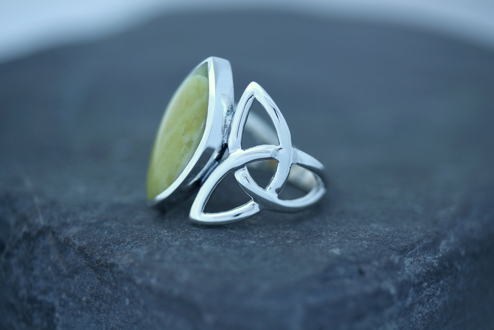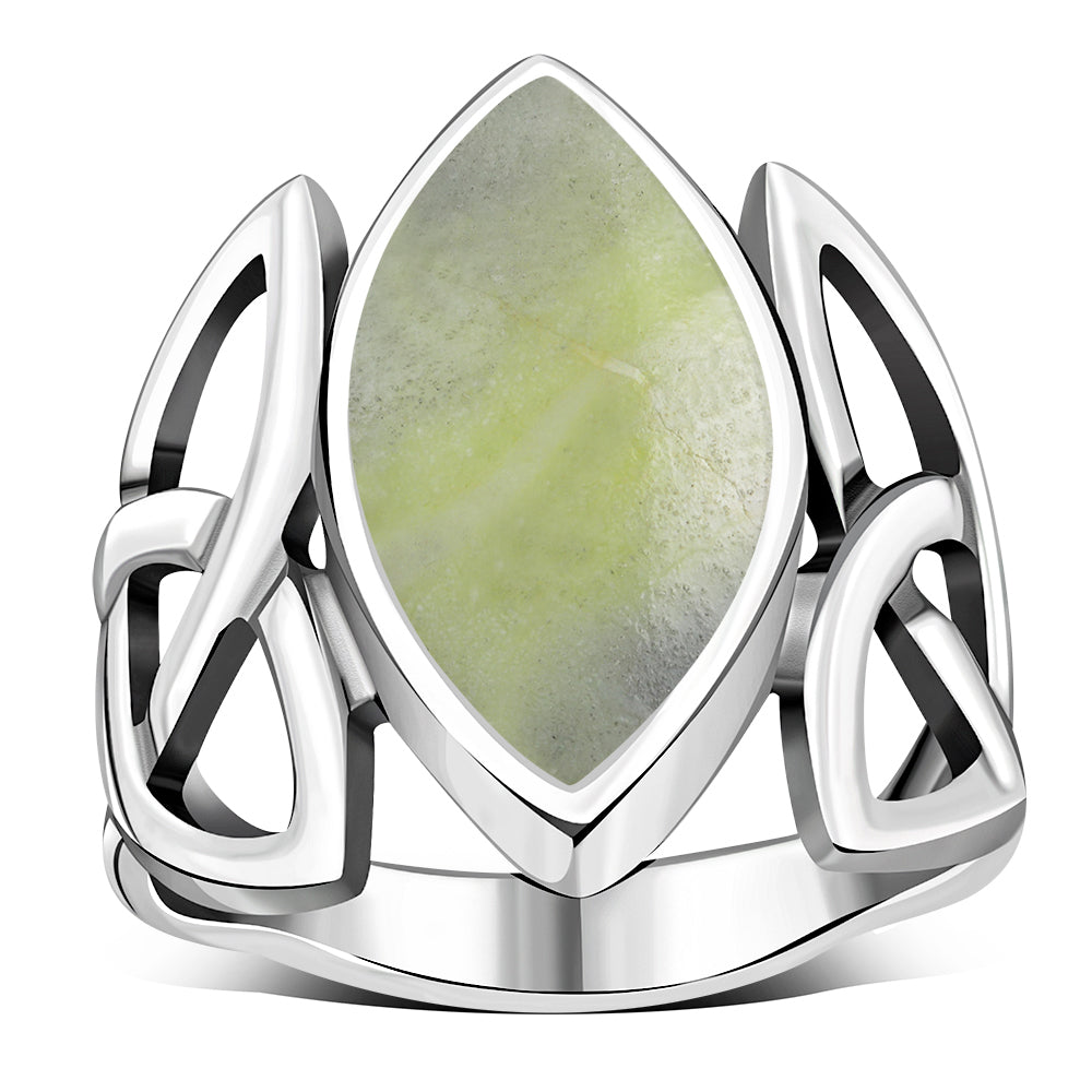A Hallmarked 925 Sterling Silver ring featuring Scottish Marble with stylish triquetra shoulders.