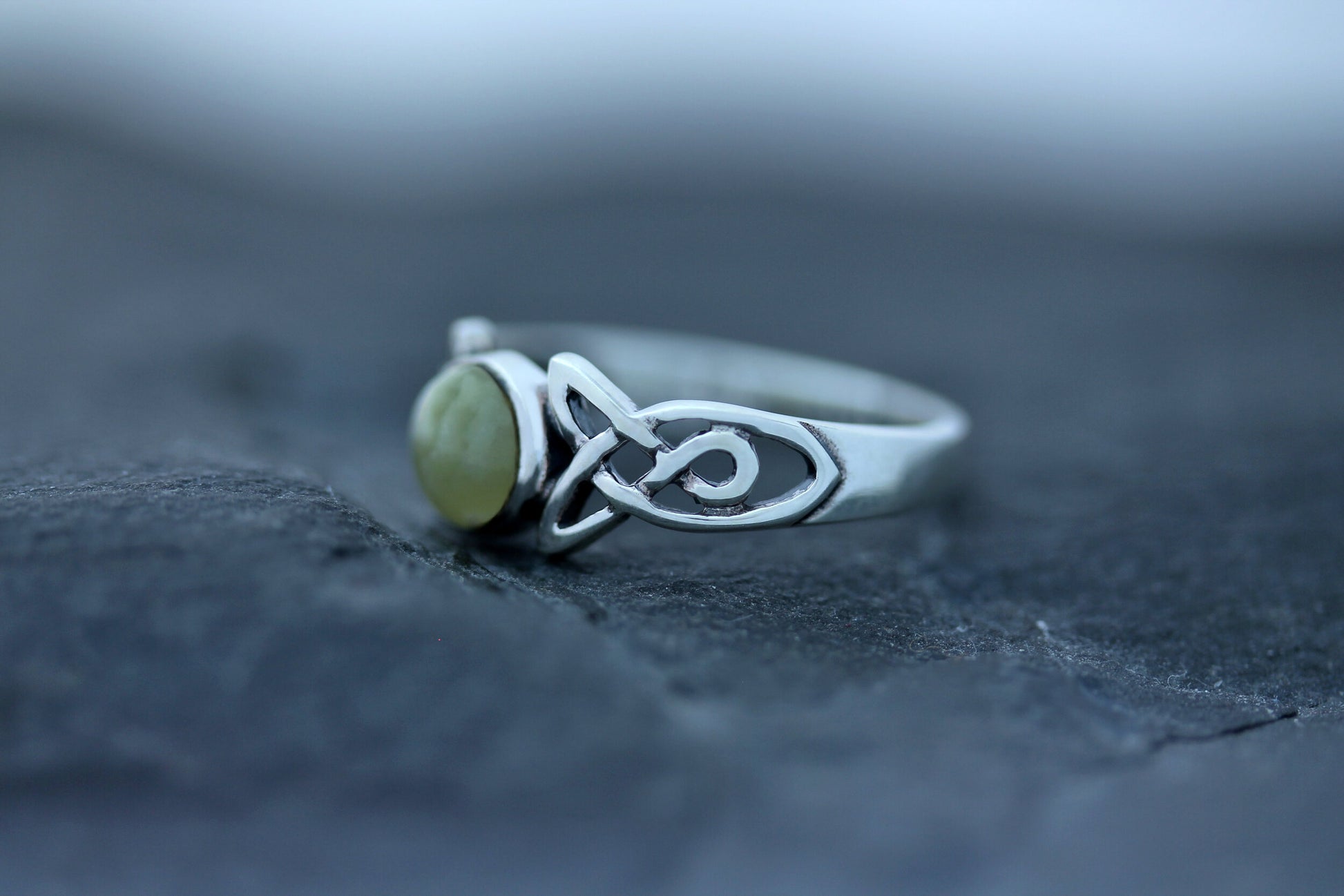A Hallmarked 925 Sterling Silver Celtic Mother-Daughter knot ring featuring a round Scottish Marble cabochon.