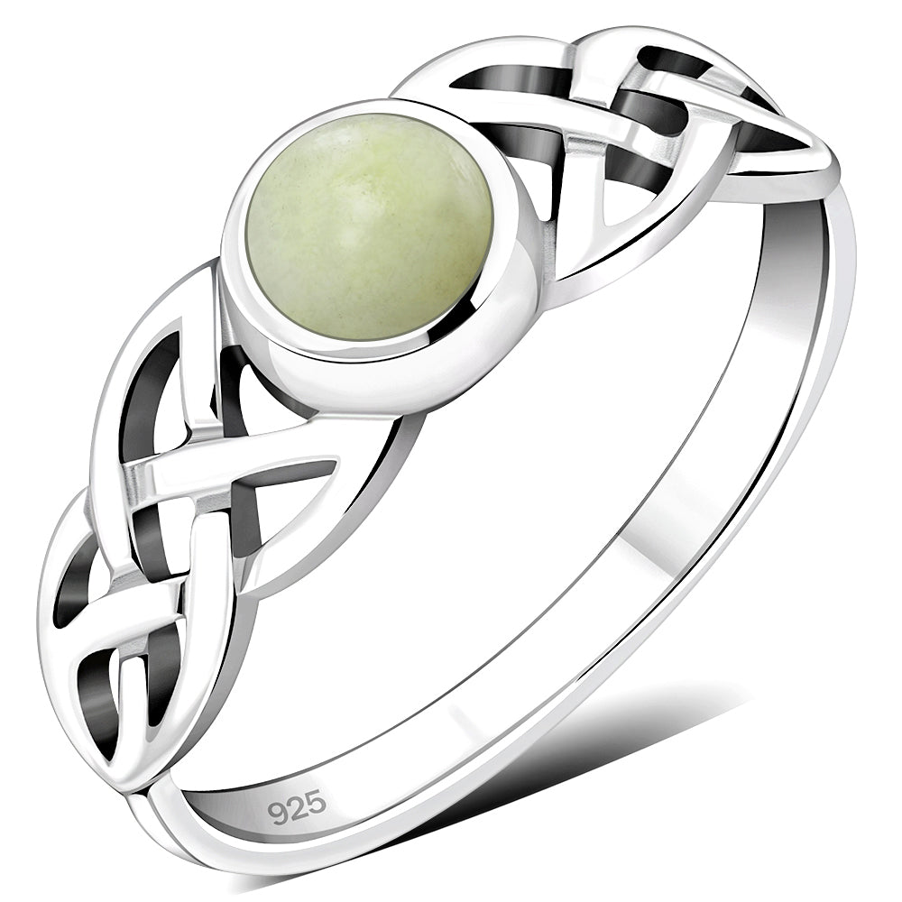 A Hallmarked 925 Sterling Silver Celtic knot ring featuring a round Scottish Marble cabochon.