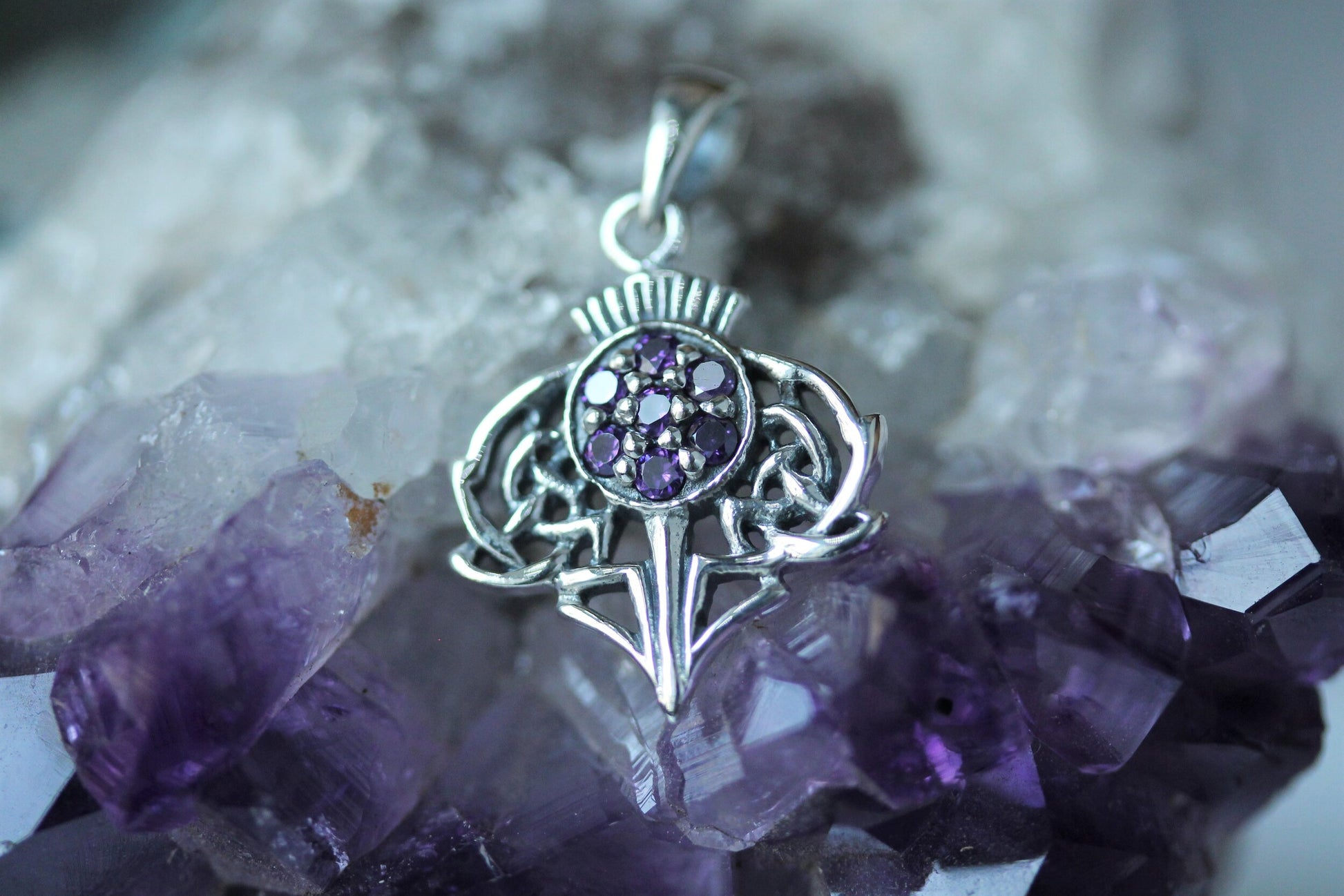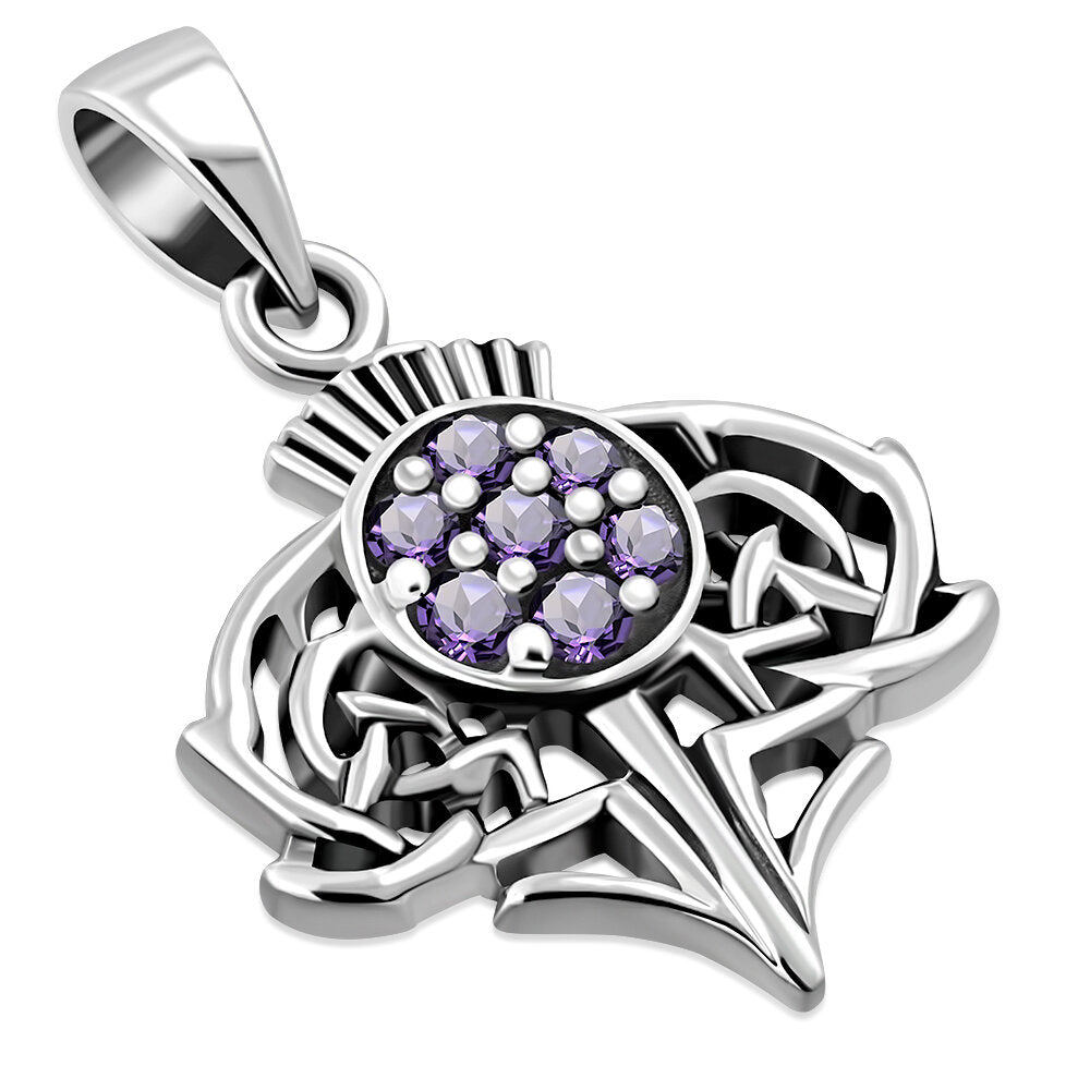 A Hallmarked 925 Sterling Silver Thistle Pendant Set with Violet Zircon.