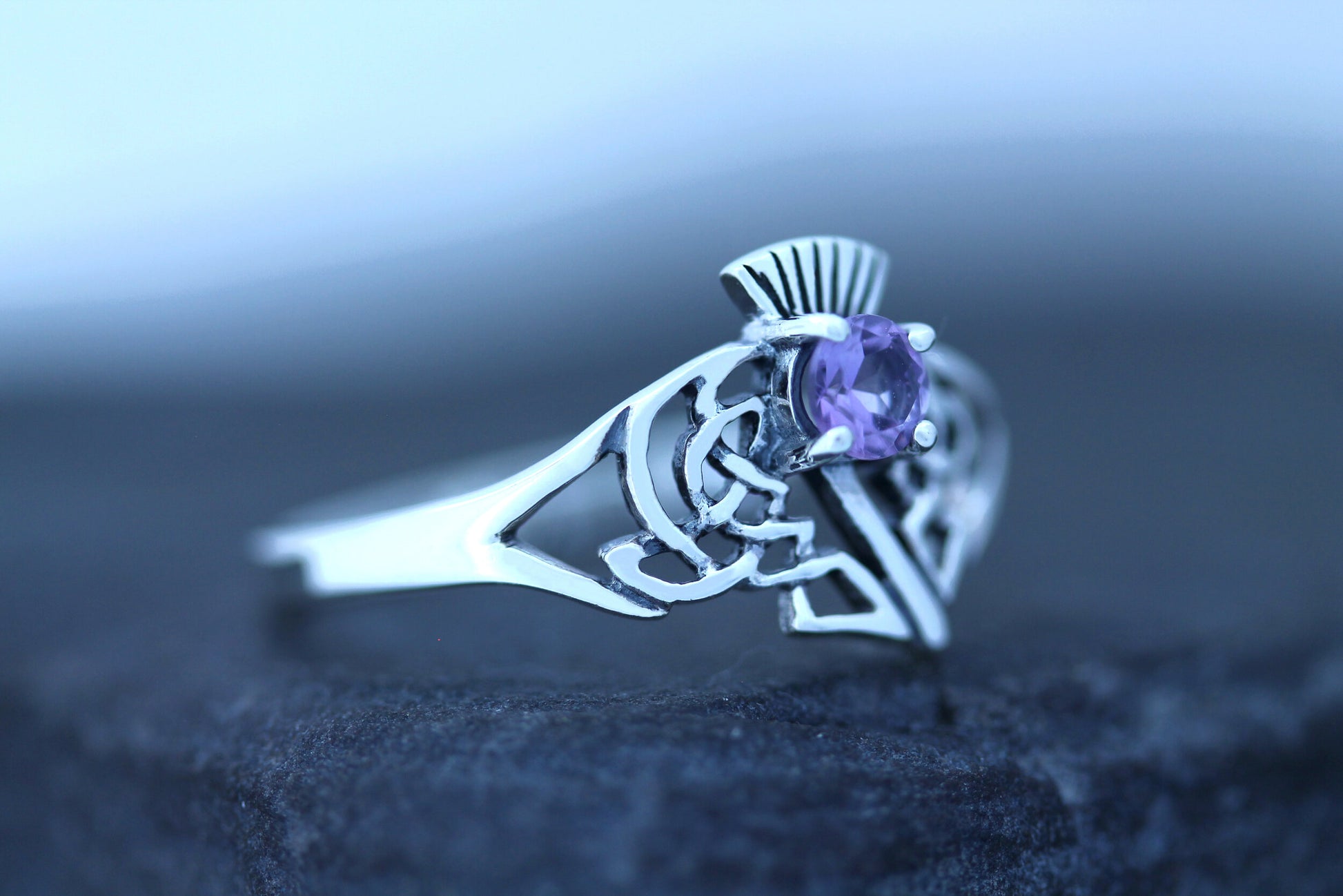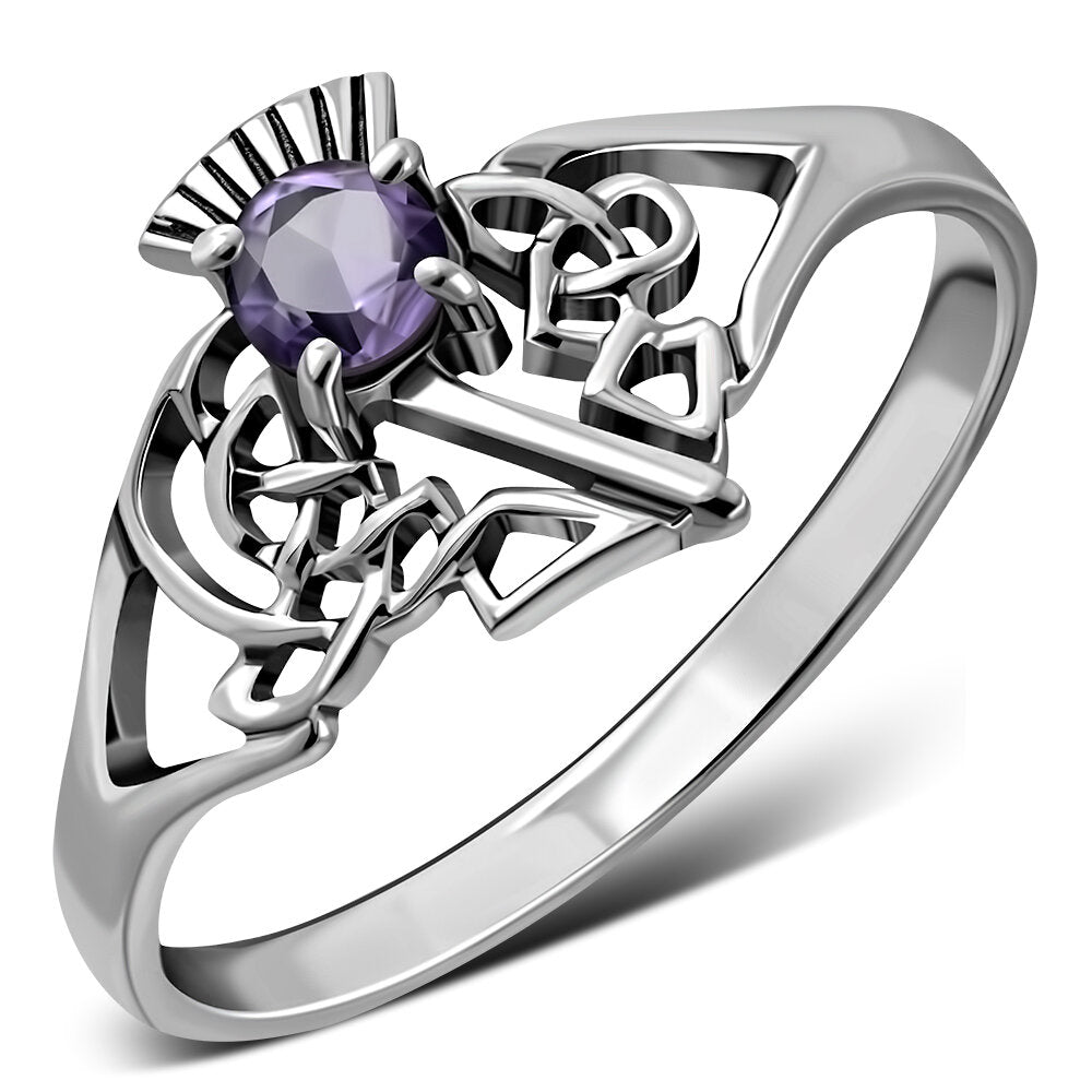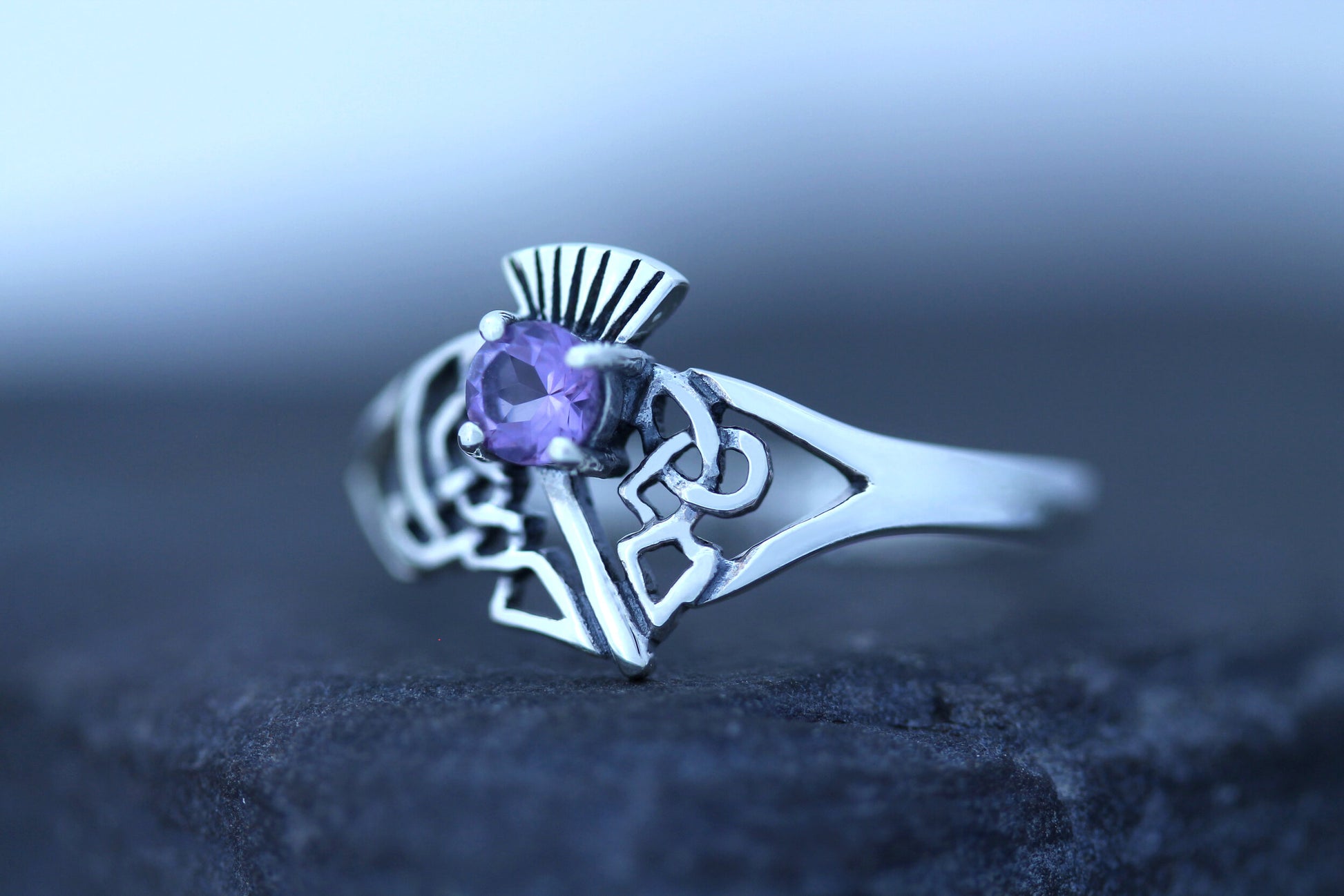 Scottish Thistle Ring with cut Amethyst set in hallmarked 925 Sterling Silver with Celtic knot details.