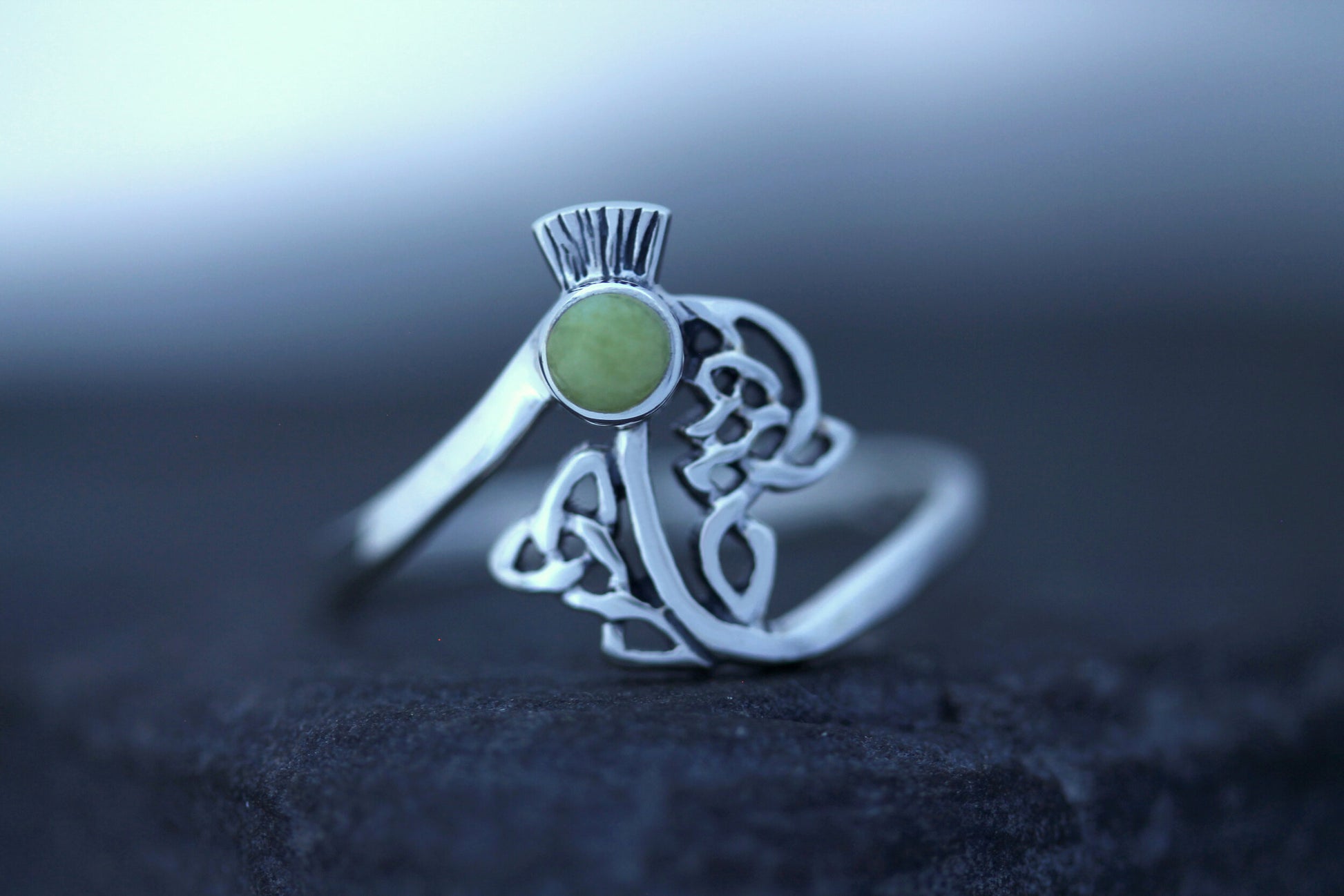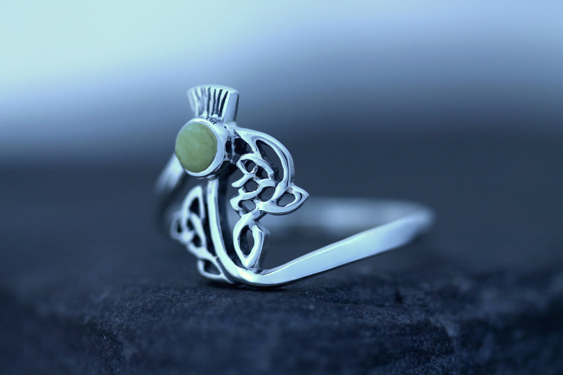 Scottish Thistle ring with woven Celtic Leaves with Scottish Marble set in hallmarked 925 Sterling Silver.